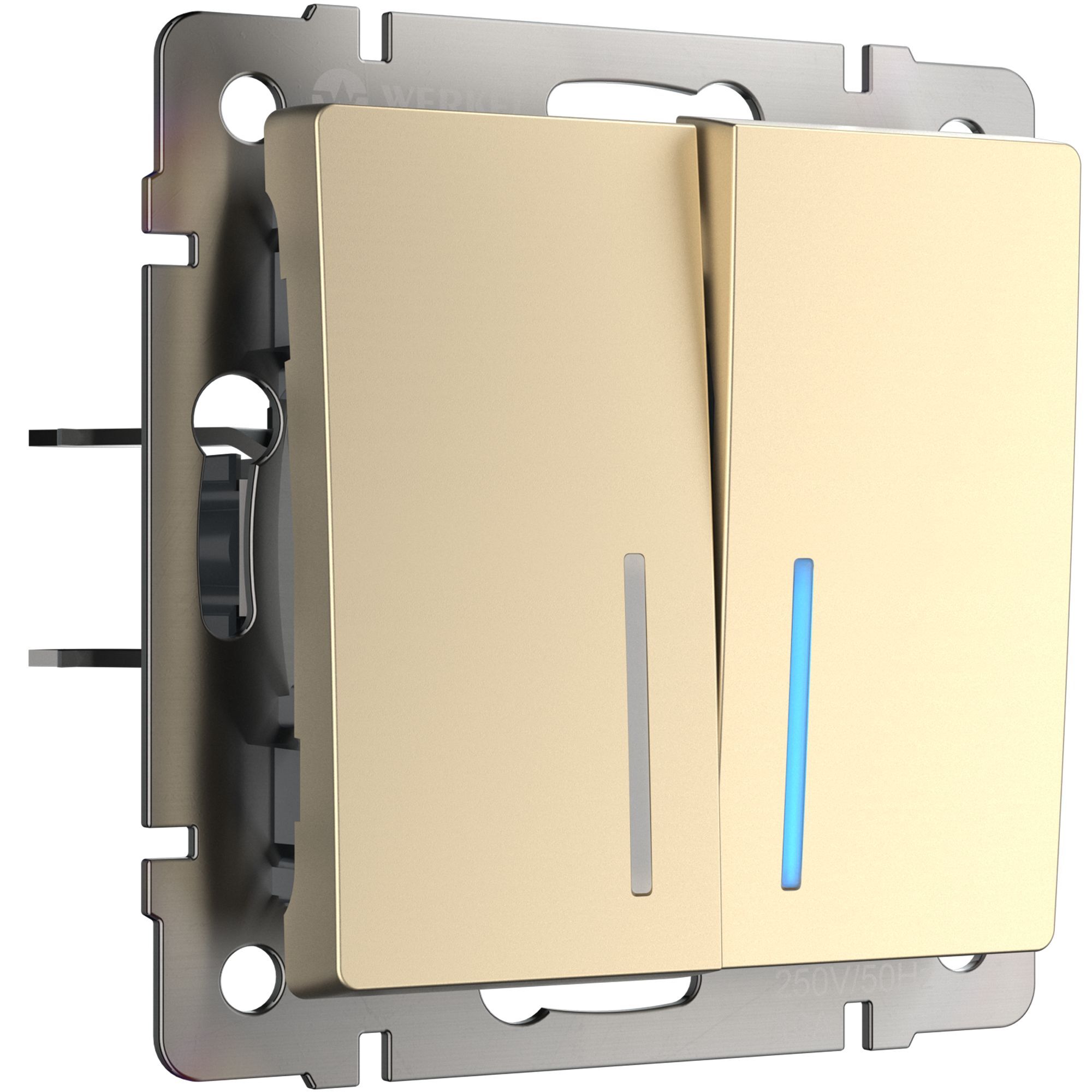 <p>Встраиваемый двухклавишный выключатель в цвете шампань с LED подсветкой 10 А 250 В, 50 Гц W1120111 является важнейшим элементом любой домашней электросети, служащим для управления света. Приглушенное свечение светодиодов позволяет легко найти выключатель в темное время суток и помогает ориентироваться в квартире, доме или помещении.</p> <p>Выключатель представляет собой механизм нажимного типа, имеющий металлический суппорт и декоративные накладки. Электроустановочное изделие монтируется в установочную коробку, оставляя видимым только внешнюю лицевую панель и накладную рамку. Механизм для скрытой установки оснащен суппортом из нержавеющей стали, позволяющий крепко зафиксировать изделие в подрозетнике.</p> <p>Надежные контакты из фосфористой бронзы и серебра выдерживают большую нагрузку и обладают большим эксплуатационным ресурсом 40 000 циклов. Накладки выполнены из высококачественного поликарбоната, устойчивого к высоким температурам. Механизм имеет удобный способ подключения проводов с сечением от 0.75 мм кв до 2.5 мм кв. Встраиваемый двухклавишный выключатель со светодиодной подсветкой характеризуется удобством использования, безопасностью и обеспечивает надежное срабатывание механизма.</p> <p></p>