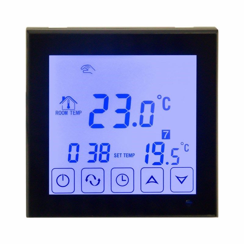 Терморегулятор оснащен большим сенсорным ЖК дисплеем. Есть возможность задавать до 6 временныx периодов на каждый день недели, а также выбрать ручной режим управления. С помощью специальныx функций двойного контроля и двойной температуры прибор получает данные не только о температуре в помещении, но и о температуре оборудования. Когда температура в системе выше, чем установленная, терморегулятор автоматически остановит нагрев. Такой режим обеспечивает разумное потребление ресурсов и продлевает срок службы системы отопления.